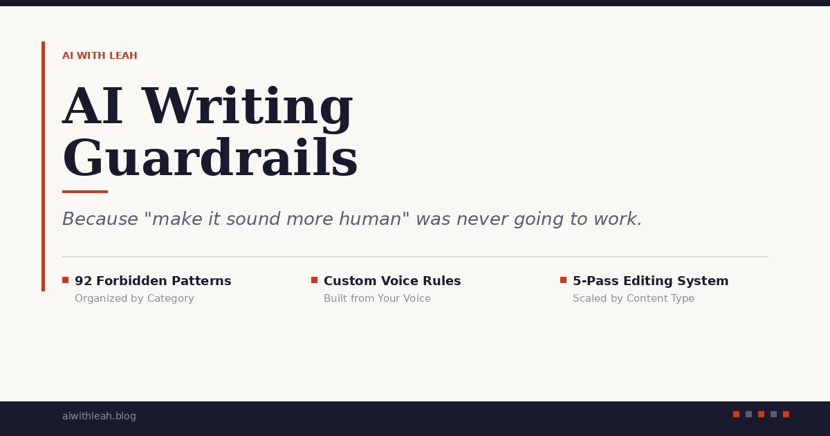 Then there’s the guardrails document. Over 90 specific patterns that AI must avoid. Mirrored contrast phrases, stacked rhetorical questions, performed vulnerability, perfect parallel structures, and dozens of other tells that make content sound like a robot cosplaying as a human. (Yes, I have literally catalogued the ways AI sounds fake. Like a lunatic. For months.)